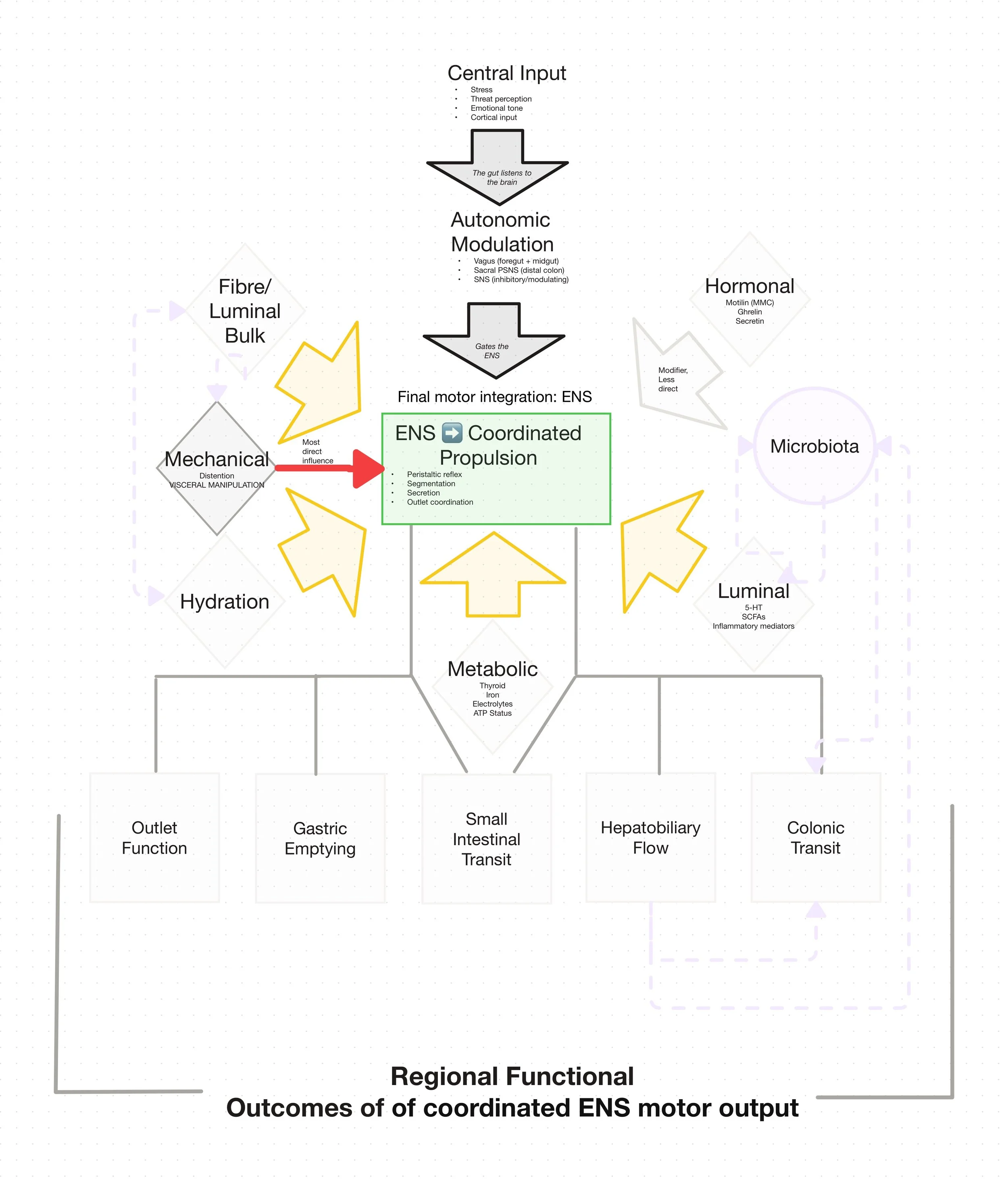 The diagram below illustrates the core process of digestive propulsion and how coordinated movement through the gastrointestinal tract ultimately leads to normal bowel function.